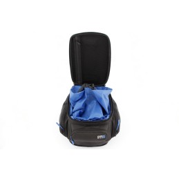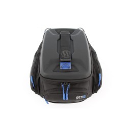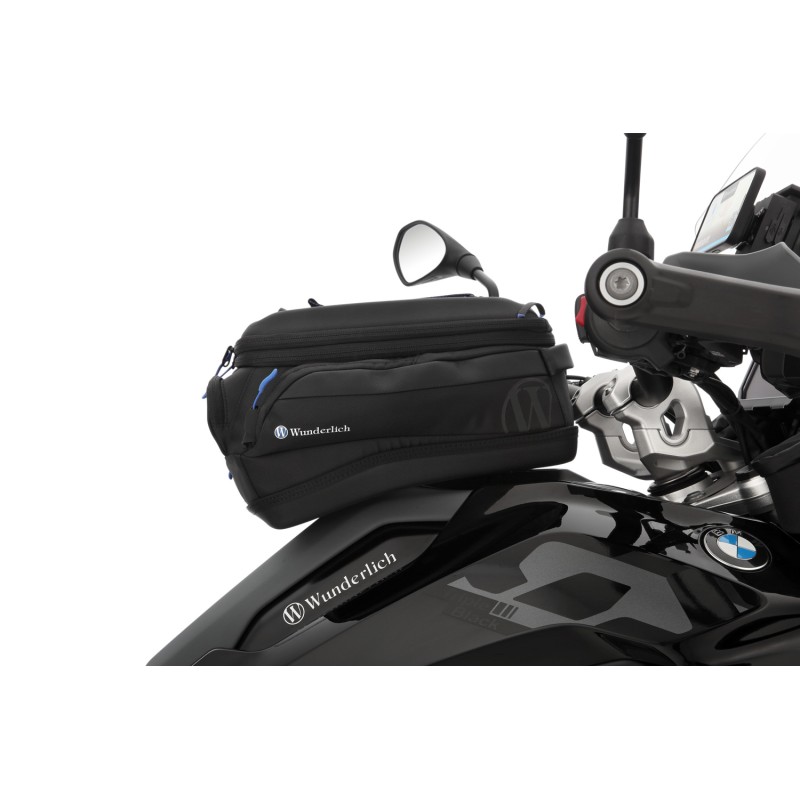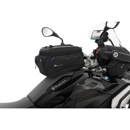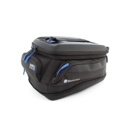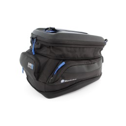 Le matériau extérieur est hydrofuge. Un sac à bagages imperméable, équipé d'une fermeture à enroulement, peut être boutonné à la sacoche de réservoir. De couleur bleue, la sacoche offre ainsi un bon contraste et une vue d'ensemble du contenu.