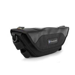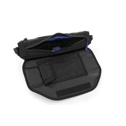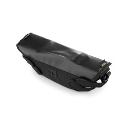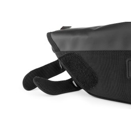 Cette sacoche est un perfectionnement de notre sacoche de guidon actuelle, sur laquelle nous avons fait un grande avancée dans le sens de la résistance à l'eau. Nous avons remplacé la partie supérieure et le rabat entier par un matériau de bâche pour camion hydrofuge et soudé la poche à portable. Le téléphone portable est ainsi parfaitement protégé.
