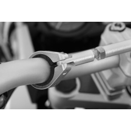 Le guidon argenté de haute qualité en aluminium, a un diamètre de 12 millimètres et la surface est sablée. En plus de l'accent mis sur l'aspect offroadtypischen, il constitue également une base idéale pour la fixation d'accessoires. La fixation de la jambe de force centrale sur le guidon est réalisée avec du Reduzierhülsen élastique, de manière à assurer un découplage de la jambe de force et du guidon. Ainsi, en particulier des dispositifs électroniques peuvent être montés amortis par vibrations.