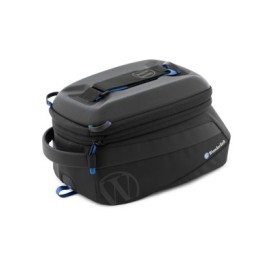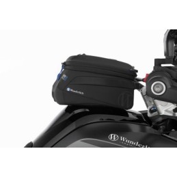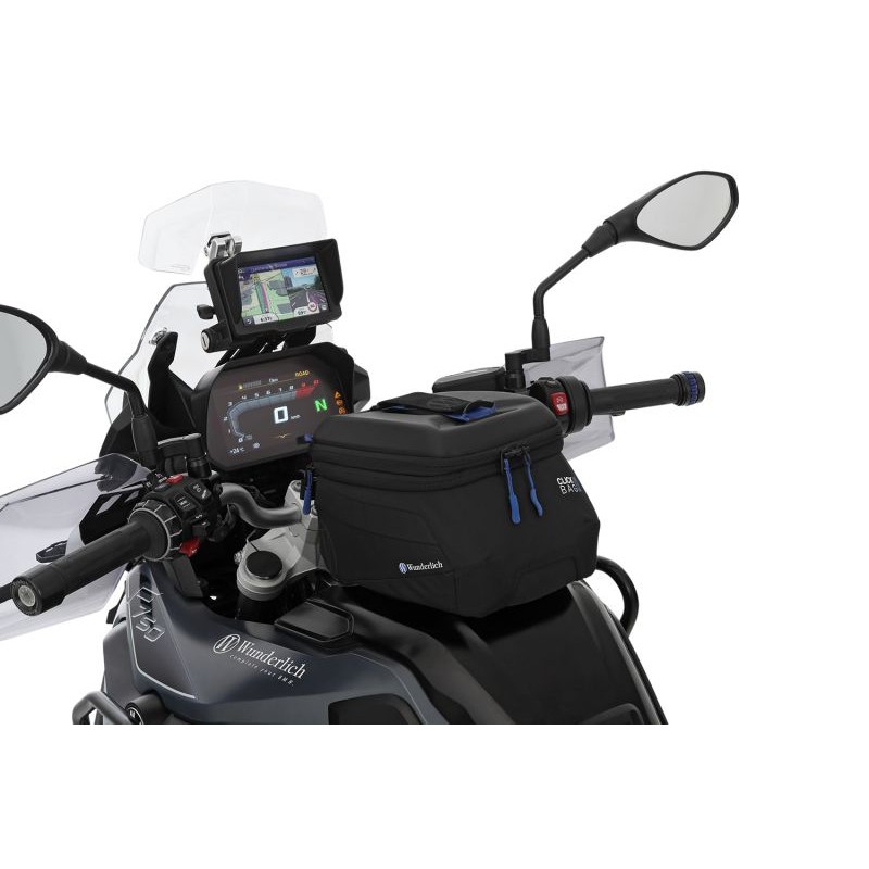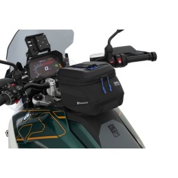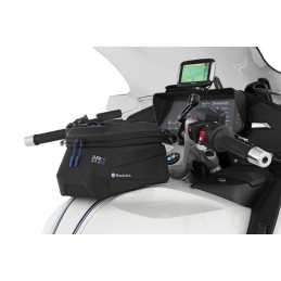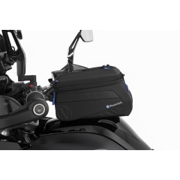 Le matériau extérieur est hydrofuge. Un sac à bagages imperméable, équipé d'une fermeture à enroulement, peut être boutonné à la sacoche de réservoir. De couleur bleue, la sacoche offre ainsi un bon contraste et une vue d'ensemble du contenu.
