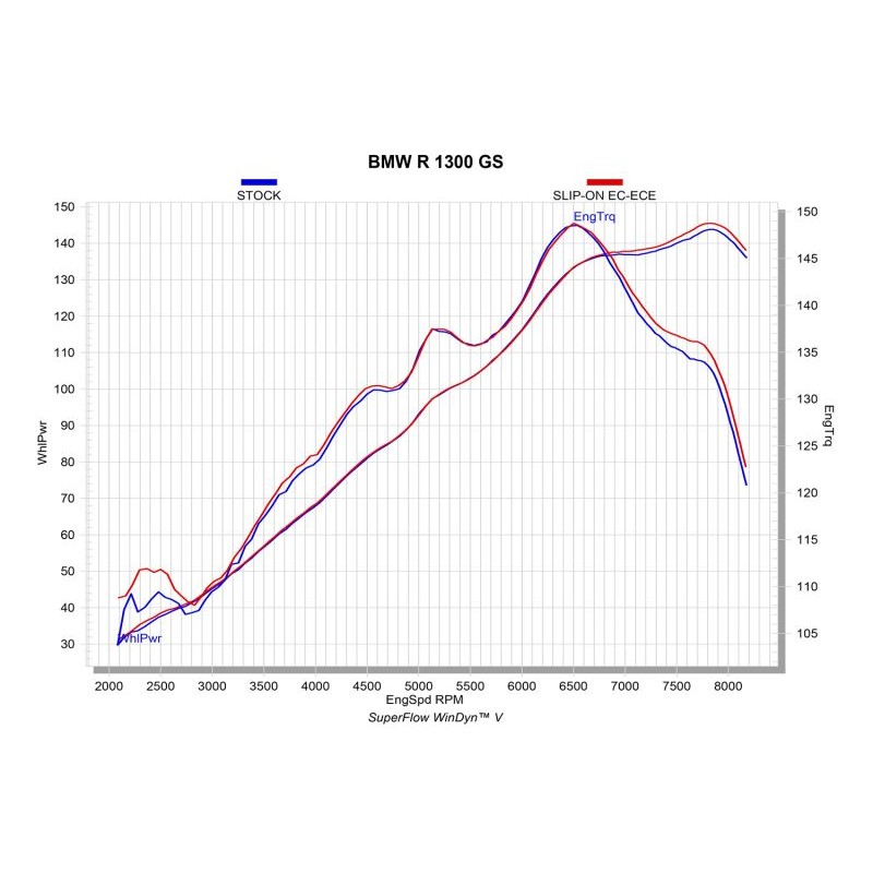 La performance et le couple augmentent de 1,4 kW (1,9 ch) à 7 600 tr/min et de 4,5 Nm à 2 300 tr/min. Ces valeurs ont été déterminées sur le banc d'essai Akrapovic par rapport à une BMW R 1300 GS (Adventure) avec un système d'échappement standard. Le système est homologué CE/ECE, et l'installation plug-and-play facile ne nécessite aucune cartographie.