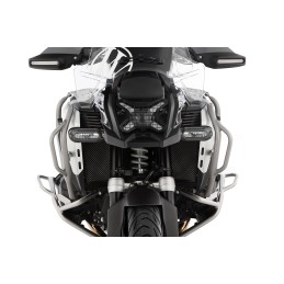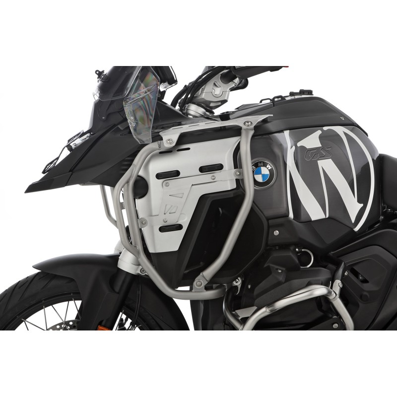 Ce pare-réservoir Wunderlich ULTIMATE est spécifiquement conçu pour la conduite Adventure. Il protège efficacement le réservoir, le carénage, la face avant et les unités de refroidissement à eau extrêmement exposées. En combinaison avec la protection anti-renversement Wunderlich, il forme un concept global de protection passive : en cas de chute, les forces sont réparties de manière optimale sur les points de fixation renforcés par la structure tubulaire, ce qui permet de réduire les pics de charge. Esthétiquement, le pare-réservoir s’intègre parfaitement dans le design de l’Adventure, tout en soulignant son caractère affirmé. Il est fabriqué à partir d’un assemblage de tubes en acier inoxydable de 25 mm, formés sur machines CNC et soudés avec soin.
