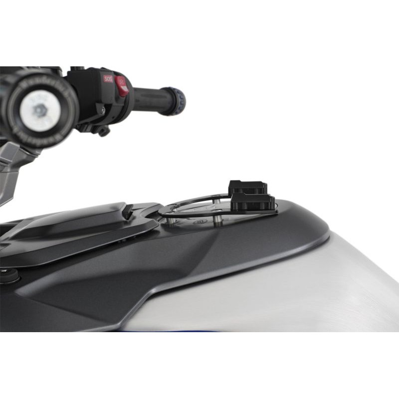 Le cercle de réservoir spécifique au modèle forme une base robuste permettant le verrouillage mécanique sécurisé des sacs de réservoir CLICK BAG. Pour la fixation, le sac CLICK BAG est guidé par le haut dans les deux glissières du cercle de réservoir jusqu’à ce que le verrouillage s’enclenche automatiquement. Le sac peut être libéré rapidement grâce à une sangle fixée sur le sac – idéal, par exemple, lors des ravitaillements.