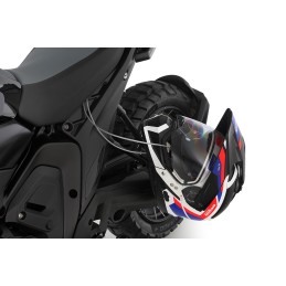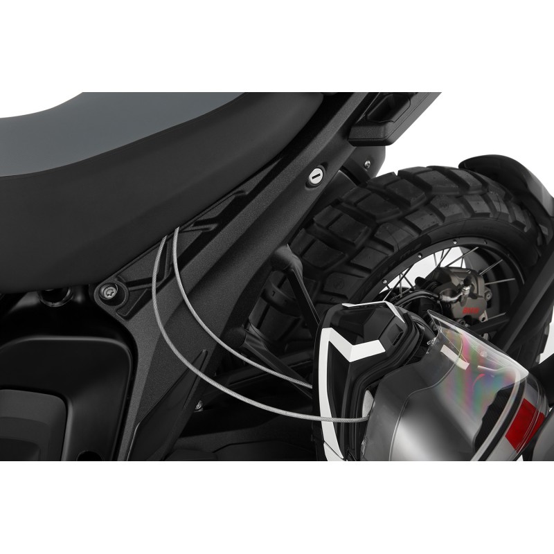 Probablement le système de sécurité pour casque le plus sûr et le plus facile à utiliser. La base robuste de notre antivol pour casque en aluminium est fixée en toute sécurité sous la selle. La longueur du câble est calculée de manière à pouvoir sécuriser jusqu'à deux casques. Le diamètre du câble métallique est de 4 mm. Les cosses solidement conçues des extrémités du câble sont accrochées au dispositif d'accrochage de la base de maintien et fixées en toute sécurité par un verrou à ressort. Il est en outre sécurisé par la selle montée et fermée à clé Il est donc ainsi impossible d'ouvrir les boucles sans soulever la selle. Vous ne trouverez cette caractéristique de sécurité que chez nous. Un autre avantage est qu'aucune serrure supplémentaire n'est nécessaire et qu'il n'est pas nécessaire d'avoir une autre clé sur soi. La gaine transparente et généreusement dimensionnée du câble de sécurité en silicone protège les casques et les motos des frottements et des dégradations de la peinture. Lorsqu'il n'est pas utilisé, le câble est toujours à portée de main et se range sous la selle, ce qui permet de gagner de la place. Notre antivol HELM-LOCK est simple d'utilisation et très utile, vous ne pourrez plus vous en passer.